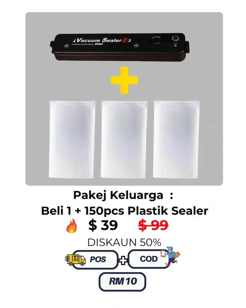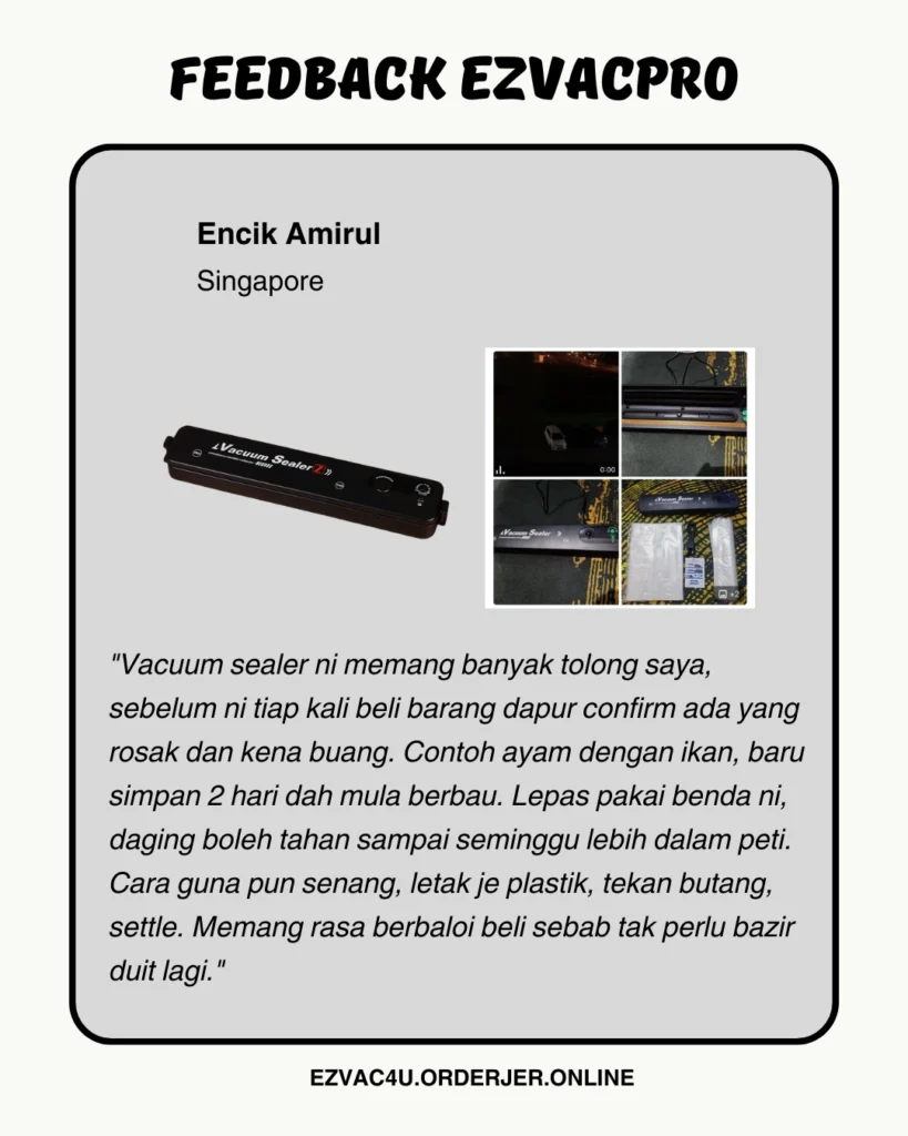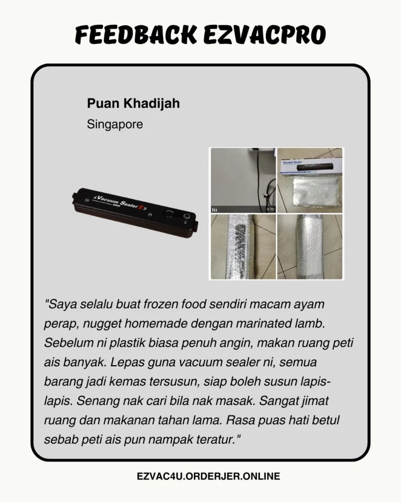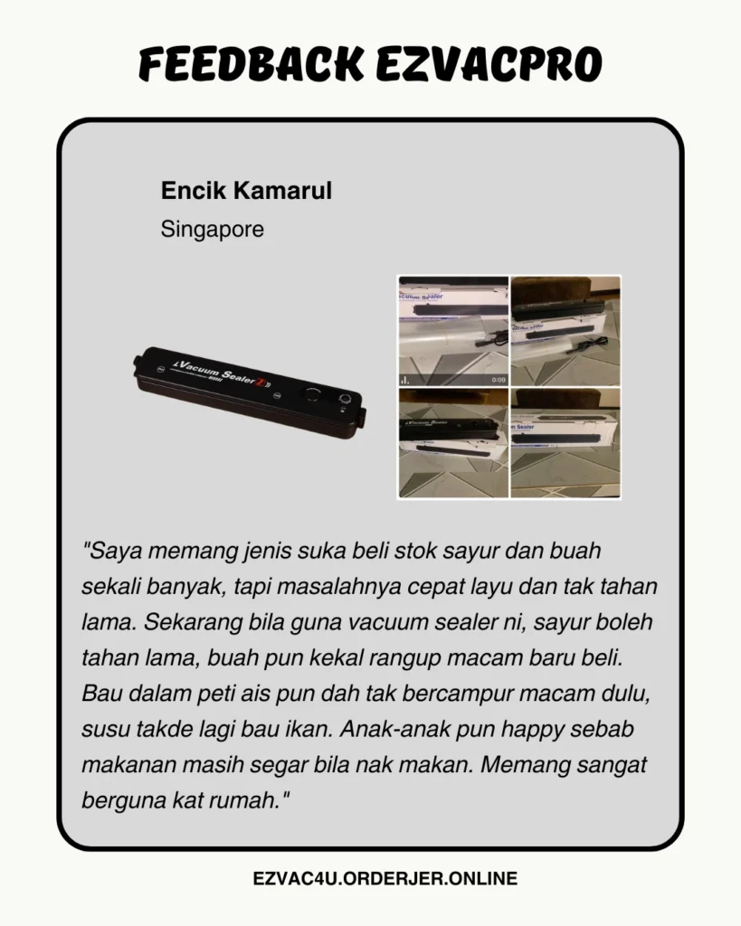 ✔️ EzVacPro mudahkan hidup – simpan makanan lebih lama, elak pembaziran, vacuum sealing anti-bakteria, rekaan automatik + cutter & datang sekali dengan plastik percuma. Wajib ada di setiap rumah!