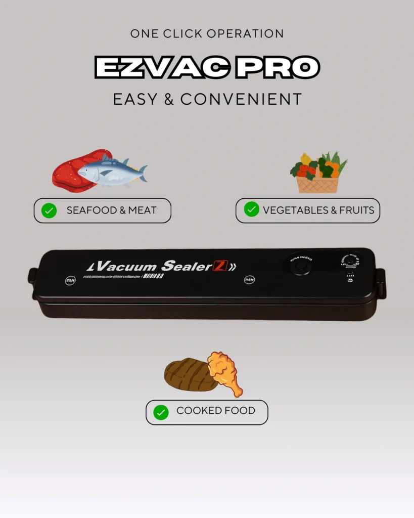 Simpan makanan lebih lama, segar & bebas bakteria! EzVacPro direka dengan sistem Vacuum Sealing Automatic + Built-in Cutter – bukan sekadar simpan, tapi juga lindungi makanan daripada rosak & elak pembaziran.